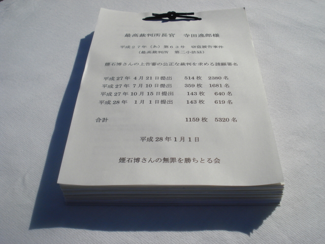 煙石博さんの上告審の公正な裁判を求める請願署名  提出合計は1159枚、5320名となりました。